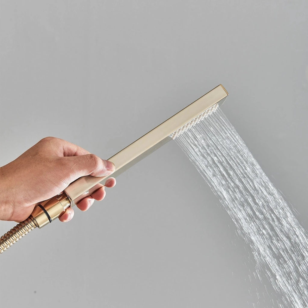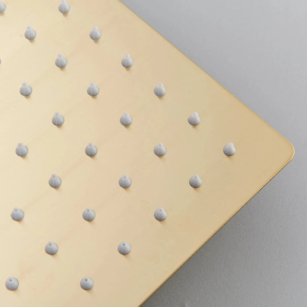 Upgrade your bathroom with the Aquari Gold Concealed Thermostatic Shower System, designed to deliver both luxury and safety in one stunning set. Featuring a large 30cm square rainfall shower head, a matching L-style handheld shower, and a solid brass concealed mixer valve, this system offers a modern, spa-like experience with every use.