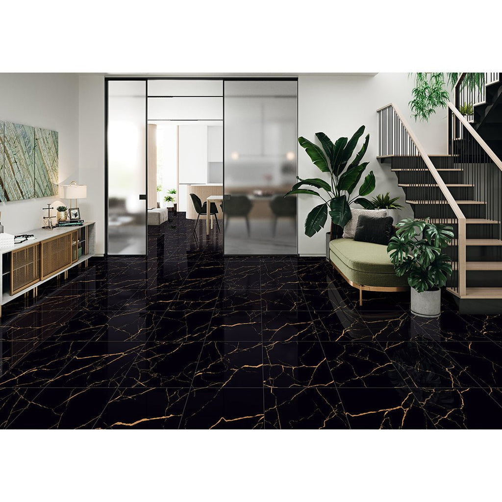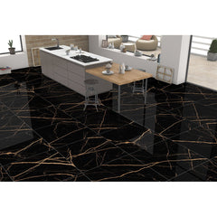 The tiles feature a striking black base, elegantly complemented by rich gold veining, embodying a timeless elegance that elevates any room. The high gloss finish not only enhances the depth and vibrancy of the colors but also contributes to the overall sophistication of the design, creating a captivating visual display.
