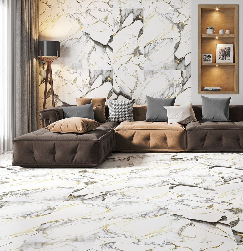 Transform your space with the timeless elegance of Magnum Gold Marble Effect Polished Porcelain Tiles, blending the classic allure of marble with the durability and affordability of porcelain.
