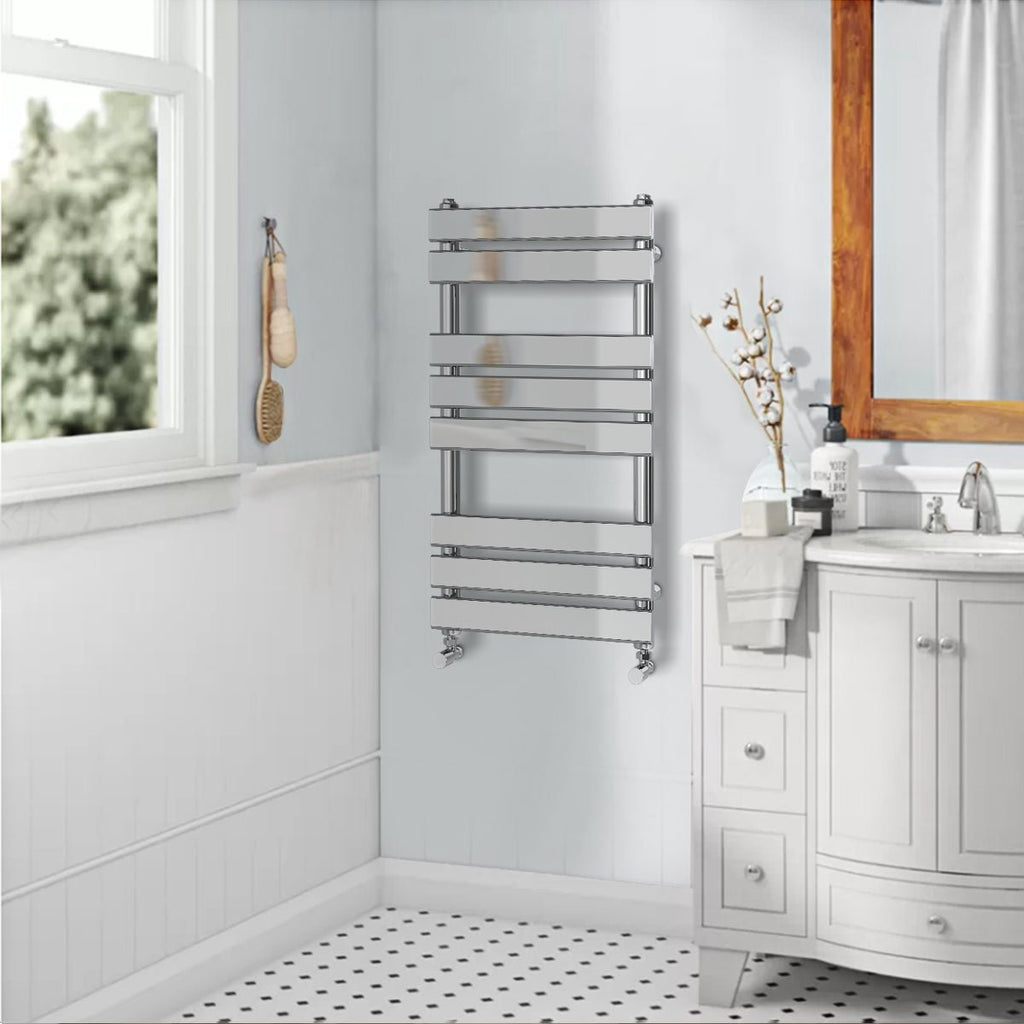 Valeno 800x450mm Chrome Heated Towel Rail – Flat Panel, Vertical Mount, Polished Finish