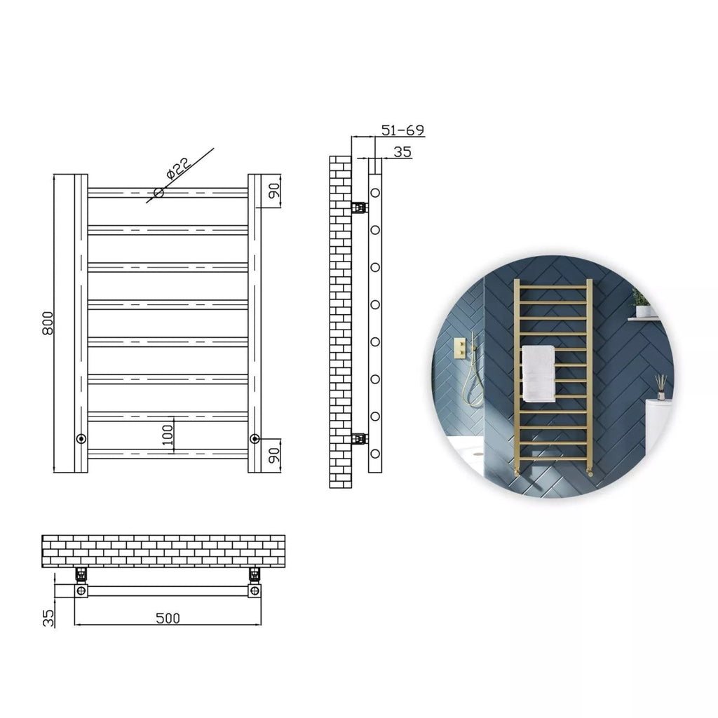 Velora Round Designer Gold Heated Towel Rail 800x500mm – Wall-Mounted Radiator